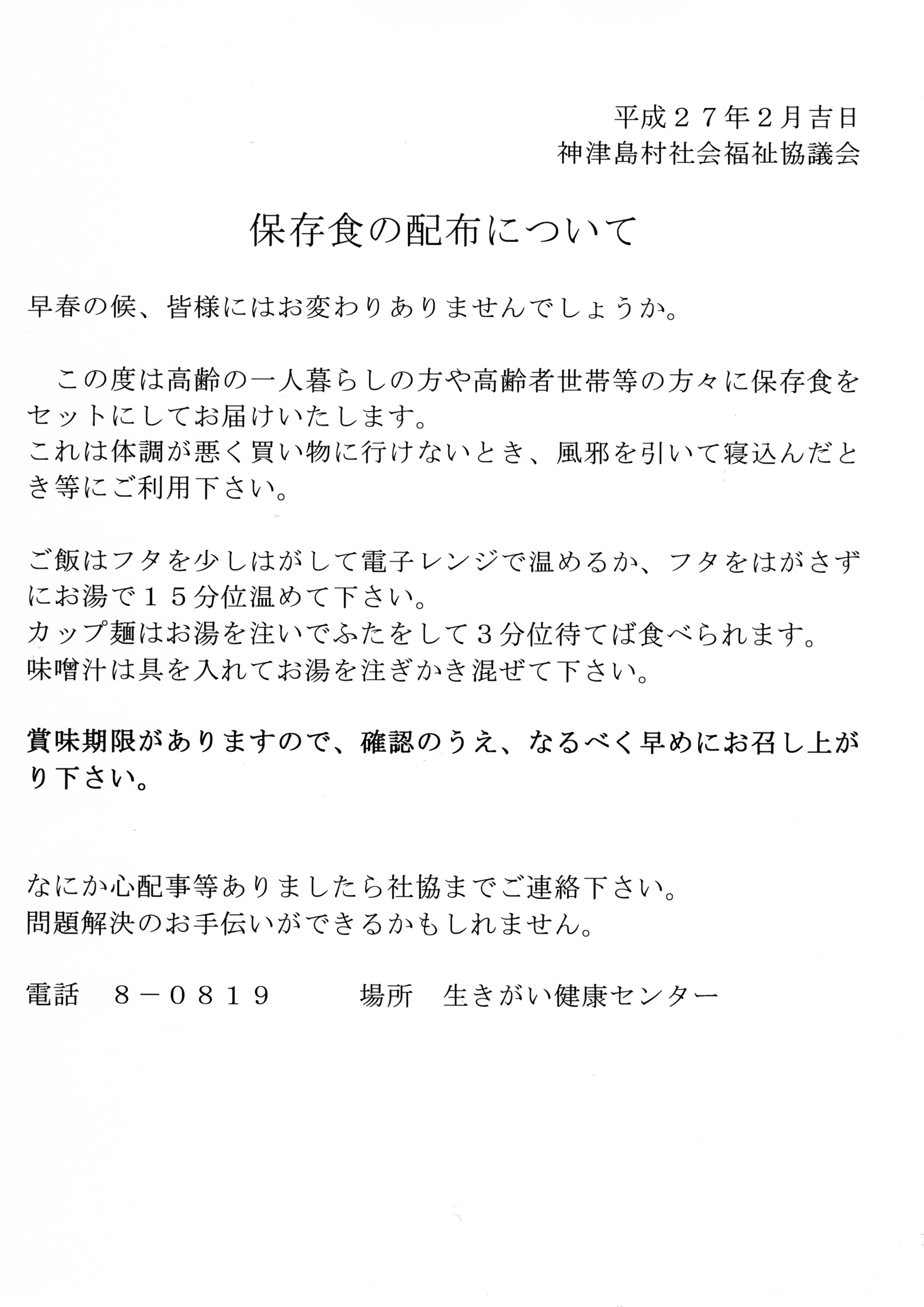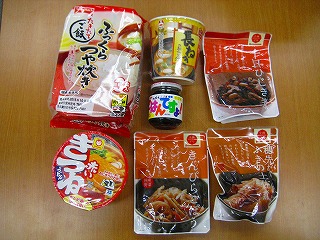 (ご飯3個・カップ味噌汁・カップうどん・ごはんですよ・煮物3点)セットをお配りしました。